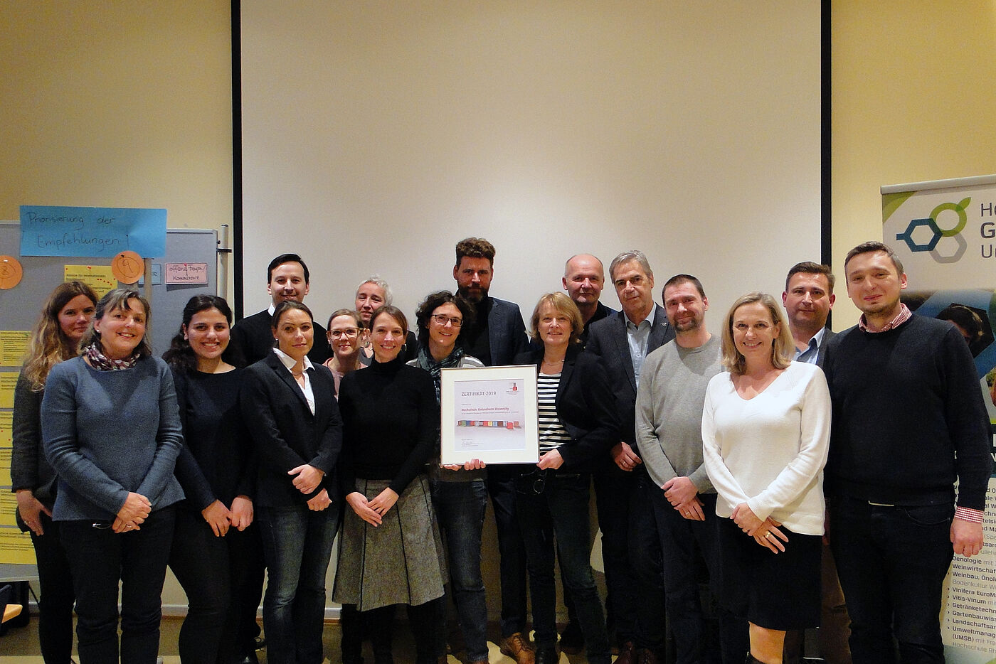 „Wir wissen genau: Unsere Studierenden erwarten nach dem Abschluss die Anforderungen eines in hohem Maße globalisierten Arbeitsmarktes. Unsere Wissenschaftlerinnen und Wissenschaftlern forschen zu Themen und Herausforderungen, die nur im globalen Verbund zu bewältigen sind; beispielhaft seien der Klimawandel, eine nachhaltige Lebensmittelproduktion und -logistik sowie die Wahrung von Biodiversität genannt. Die Internationalisierung ist deshalb ein zentraler Baustein in der Strategie unserer Hochschule; nur mit einem klaren internationalen Profil können wir unseren Studierenden und Mitarbeitenden Chancen eröffnen und gesamtgesellschaftliche Mehrwerte schaffen“, betont Prof. Dr. Hans Reiner Schultz, Präsident der Hochschule Geisenheim. Um sich selbst zu stärken, hat die Hochschule Geisenheim deshalb 2019 in einem zehnmonatigen Prozess das Audit „Internationalisierung der Hochschulen“ der Hochschulrektorenkonferenz (HRK) durchlaufen und erfolgreich abgeschlossen. Dafür erhielt sie im Rahmen der HRK-Jahreskonferenz in Berlin das offizielle Zertifikat.