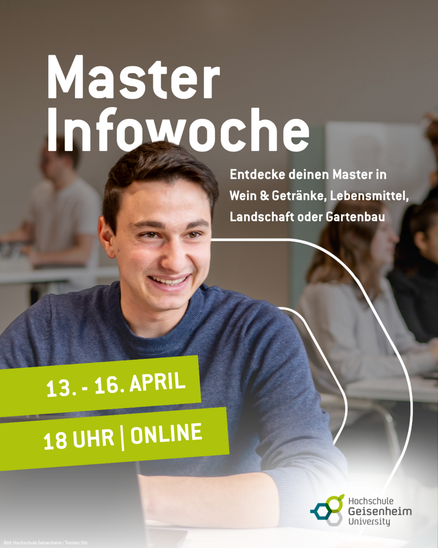 Du willst nach dem Bachelor beruflich und fachlich durchstarten? Dann informiere dich bei der Master-Info-Woche der Hochschule Geisenheim im Dezember über unsere spezialisierten Master-Studiengänge in den Bereichen Wein, Getränke, Lebensmittelsicherheit, Landschaftsarchitektur und Gartenbau.