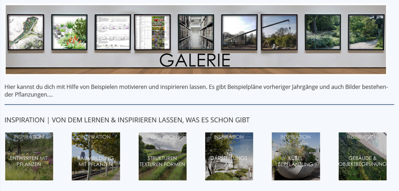 Ein weiteres Element stellt die GALERIE dar, die in erster Linie das Lernen anhand von Beispielen fördern soll. Darin werden strukturiert nach den gängigen Planungsphasen der Landschaftsarchitektur Beispiele in einem Blog besprochen. Der Fokus liegt hierbei auf der planerischen Darstellung und Präsentation. Es ist geplant diese Sektion mit Audiokommentaren und kurzen Podcast-Diskussionen zu unterstützen.
