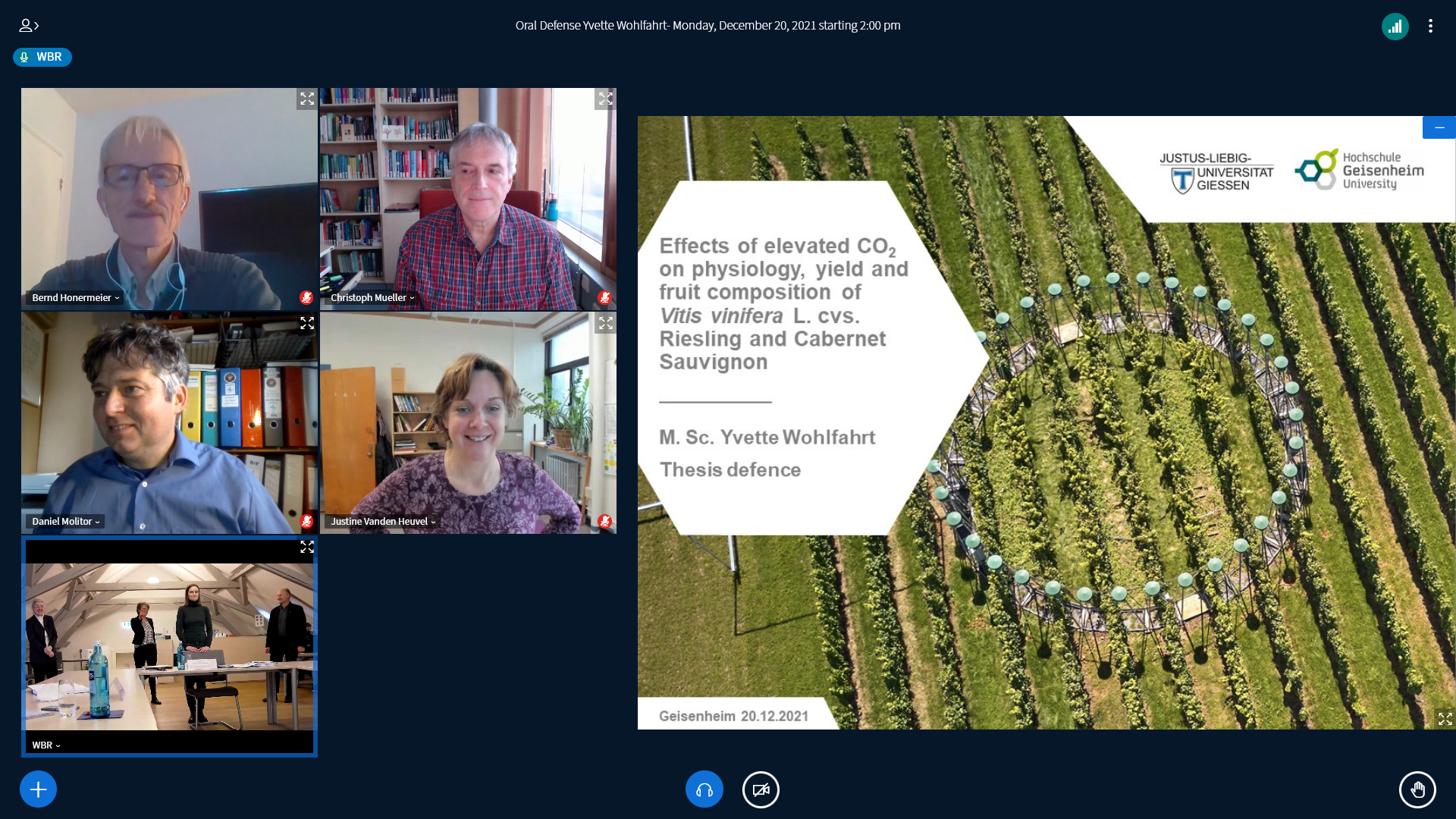 Yvette Wohlfahrt successfully defended her doctoral thesis titled “Effects of elevated CO2 on physiology, yield and fruit composition of Vitis vinifera L. cvs. Riesling and Cabernet Sauvignon“ on December 20th, 2021 at Hochschule Geisenheim University.