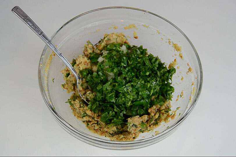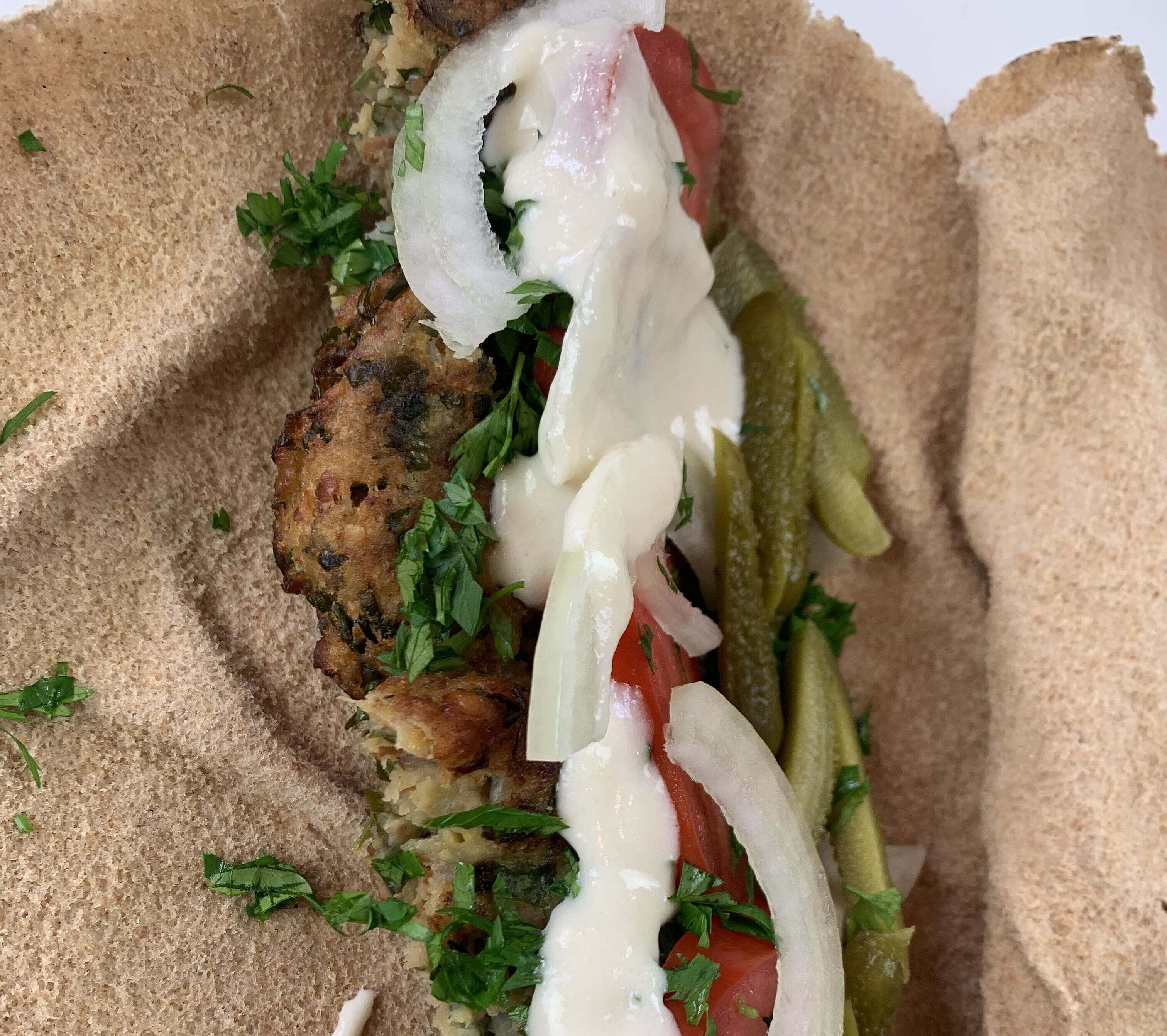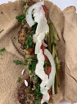 Before the event itself, our international students had the opportunity to register and pick up a bag filled with authentic Lebanese ingredients, which had been carefully prepared by our Lebanese student assistant Charbel Jreijiri. Some of the main ingredients were fava beans, chick peas, cumin, flat leaf parsley, coriander, garlic, tahini, Lebanese hummus, and Lebanese flat bread, also known as Lebanese pita bread. The preparation included a lot of chopping of the vegetables and mashing of the peas and beans, mixing into a sort of a paste then frying in oil or grilling on the pan with no oil and then wrapping it in the pita bread with the greens and the tahini after preparing it into "tarator", a tahini-lemon sauce.