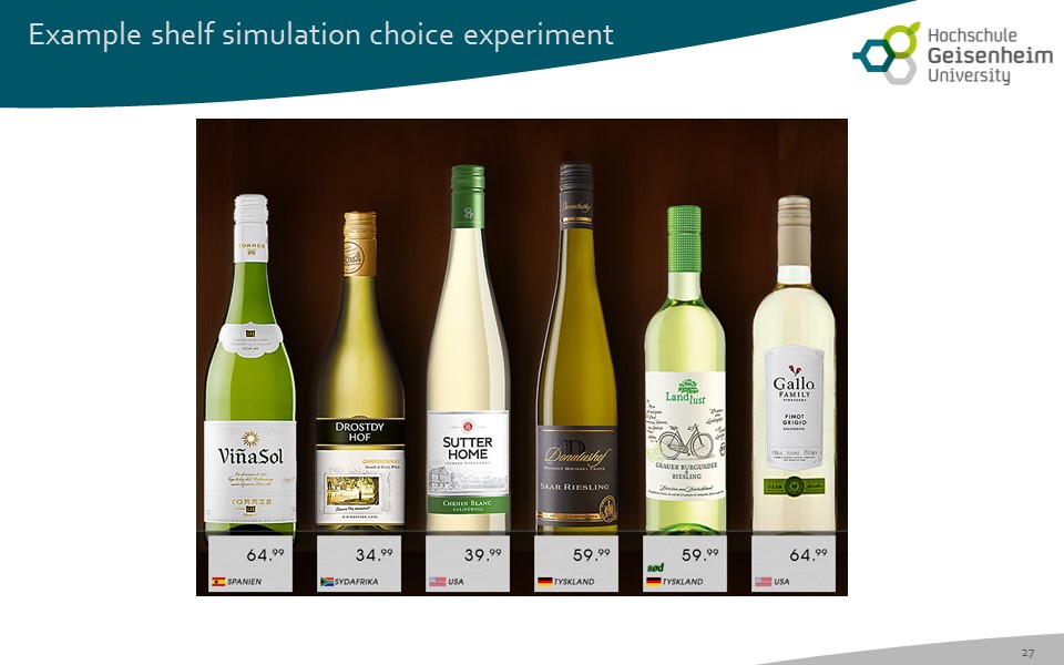 Evelyn Pabst, M.Sc., has been carrying out research in the improved marketing of German wine for export, since the middle of 2017, as a doctoral student in the Geisenheim University's Department of Wine and Beverage Business. The project, which is funded by the Federal State of Rheinland-Palatinate and the Association for German Viticulture Research, focuses on Poland, Denmark and Great Britain, looking at improving the marketing of mid-price German wines in food retail. The project includes an online survey comparing new product ideas with products already on the market. Pabst used a shelf simulation for this, in which consumers could choose wine from a supermarket shelf graphic, just as they would in a supermarket.