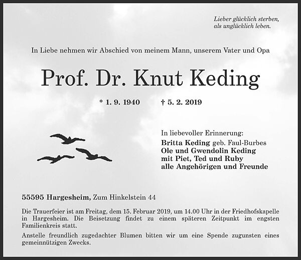 On February 5, 2019 Professor Knut Keding sadly passed away at the age of 78. The memorial service takes place on Friday, February 15 at 2 p.m. in the cemetery chapel, Hargesheim.