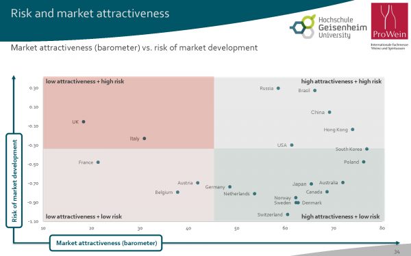The lowest improvements are expected for Great Britain, France, Austria, Italy and Belgium. In France and Italy per capita wine consumption is still on a slight decline and on both markets predominantly domestic wine is drunk, which means fewer sales options for wine exporters. The forthcoming Brexit and constant rise in the tax on wine are the main reasons why wine producers rate Great Britain very low in terms of market attractiveness.