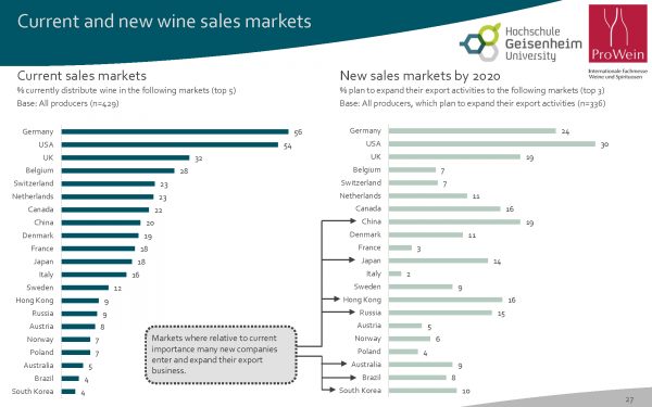 Nine out of ten leading international wine producers plan to extend their exports to new markets by 2020. Among wine exporters from the large European producer countries Italy, Spain and France this proportion stands at almost 100% and in Germany, which exports less, it stands at 55%.