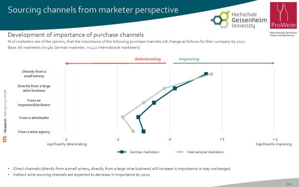 The verdict we can draw is that the wine sector is facing changes that are also reflected in the different future outlooks of the various market participants. Producers are increasingly looking to new distant wine markets and marketers are facing structural changes in the sale of wine where primarily sales via traditional wine merchants will decline. By contrast, purchasing wine via food retail and online will continue to rise. The wine trade between producers and marketers will change and supply chains will become even shorter as wine will be ordered direct from the producer. It will be interesting to see how this development unfolds over the next few years.