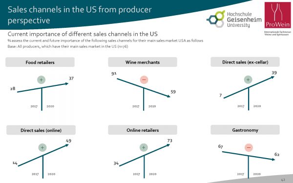 In the USA very similar trends can be observed concerning increased wine sales online and via food retailers and a decline in wine merchants/speciality wine retail. Unlike in Germany, where ex-cellar sales from small wine-growing estates are considered stable, this trend is anticipated to rise strongly in the US. This specific development reflects two current trends in the US: the number of small wine-growing estates is currently growing at a rate of 4% and “direct-to-consumer” sales from winemakers to end consumers is booming with double-digit growth rates.
