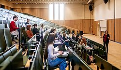 The lower floor of the building features a large foyer and a lecture hall with 657 seats, which is able to be divided as needed. An open staircase leads to the seminar rooms on the upper floor, which can seat up to 300 students.