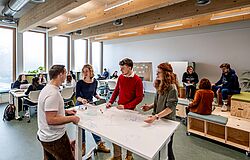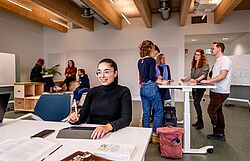 One of the seminar rooms is home to the CoLAB space, a room for competence-based, collaborative teaching and learning. The CoLAB is designed around a room-within-a-room concept, with movable partitions and innovative, versatile furniture that can be quickly adapted to create individual islands for different ways of working.