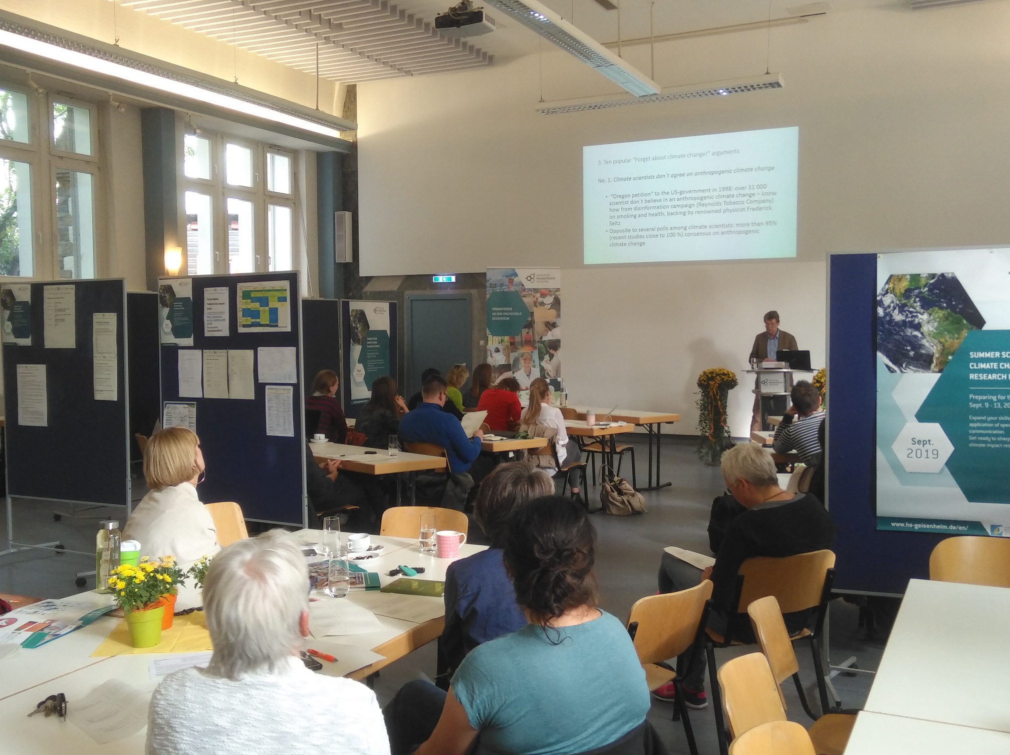In one of the workshops, Professor Achim Bubenzer, former president of the University of Applied Sciences in Ulm, put forward arguments to counter climate change denial, while Dr. Michael Schirrmann from the Leibniz Institute for Agricultural Engineering and Bioeconomy (ATB) provided profound insights into the performance of meta-analyses. The summer school's interdisciplinary approach was clearly obvious in Sven-Daniel Getty's workshop by Science-Slam.com, which provided the participants with key tools on communicating in the field of science that they could put into practice right away. As viticulture experts, Professor Gregory Gambetta and Dr. Philippe Pieri from the Institut des Sciences de la Vigne et du Vin (ISVV) in Bordeaux provided the Rheingau summer school participants with a French point of view on the impacts of climate change.