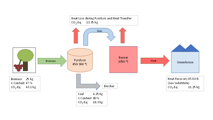 Typically, 25 kg of biomass bond 43.1 kg of CO2. During the pyrolysis process, gas and biochar are formed, the latter containing roughly half of the bonded CO2. The gas can be used for heat generation, partially for the heating of our greenhouses. 13.35 kg of CO2 are lost to the environment during pyrolysis and heat transfer.