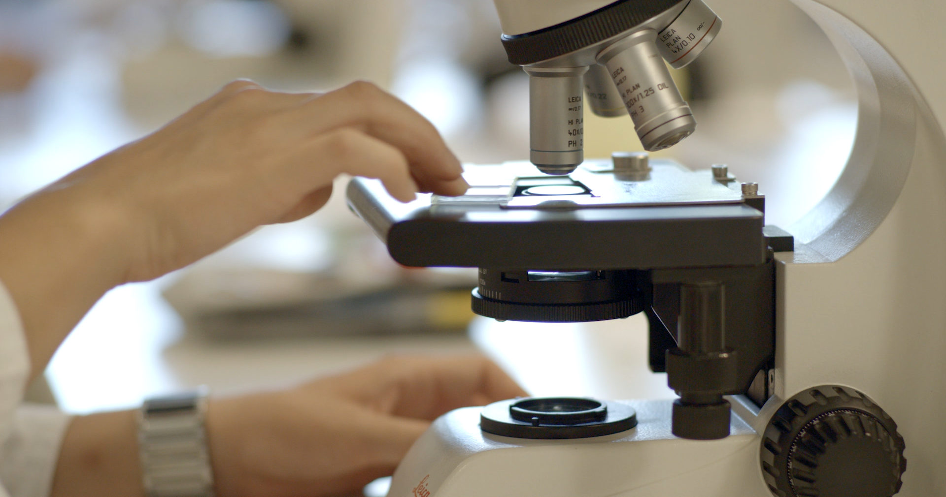 Eine Hand schiebt einen Objektträger unter ein Mikroskop. © Hochschschule Geisenheim