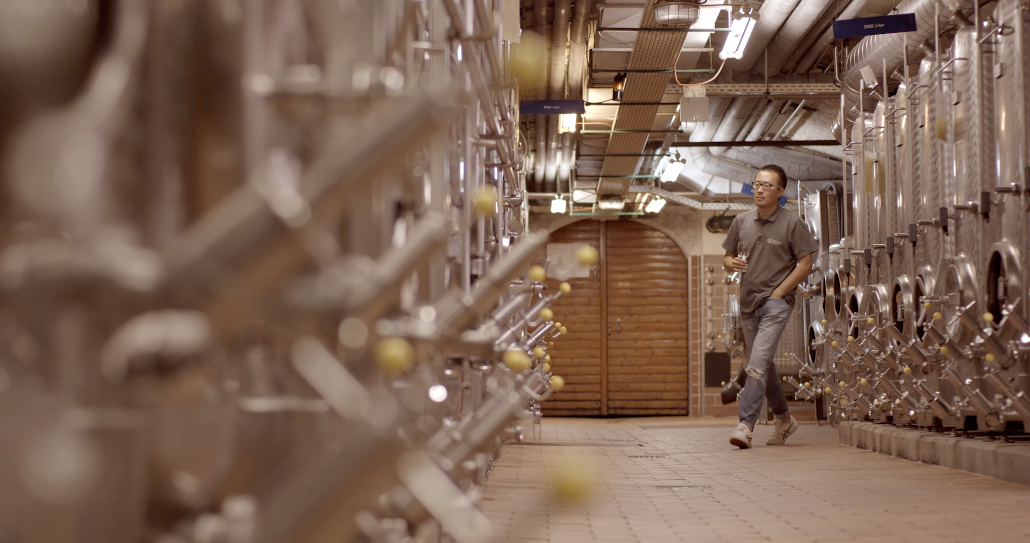 Ein junger Chinese läuft durch einen Weinkeller mit Stahltanks. © Hochschule Geisenheim