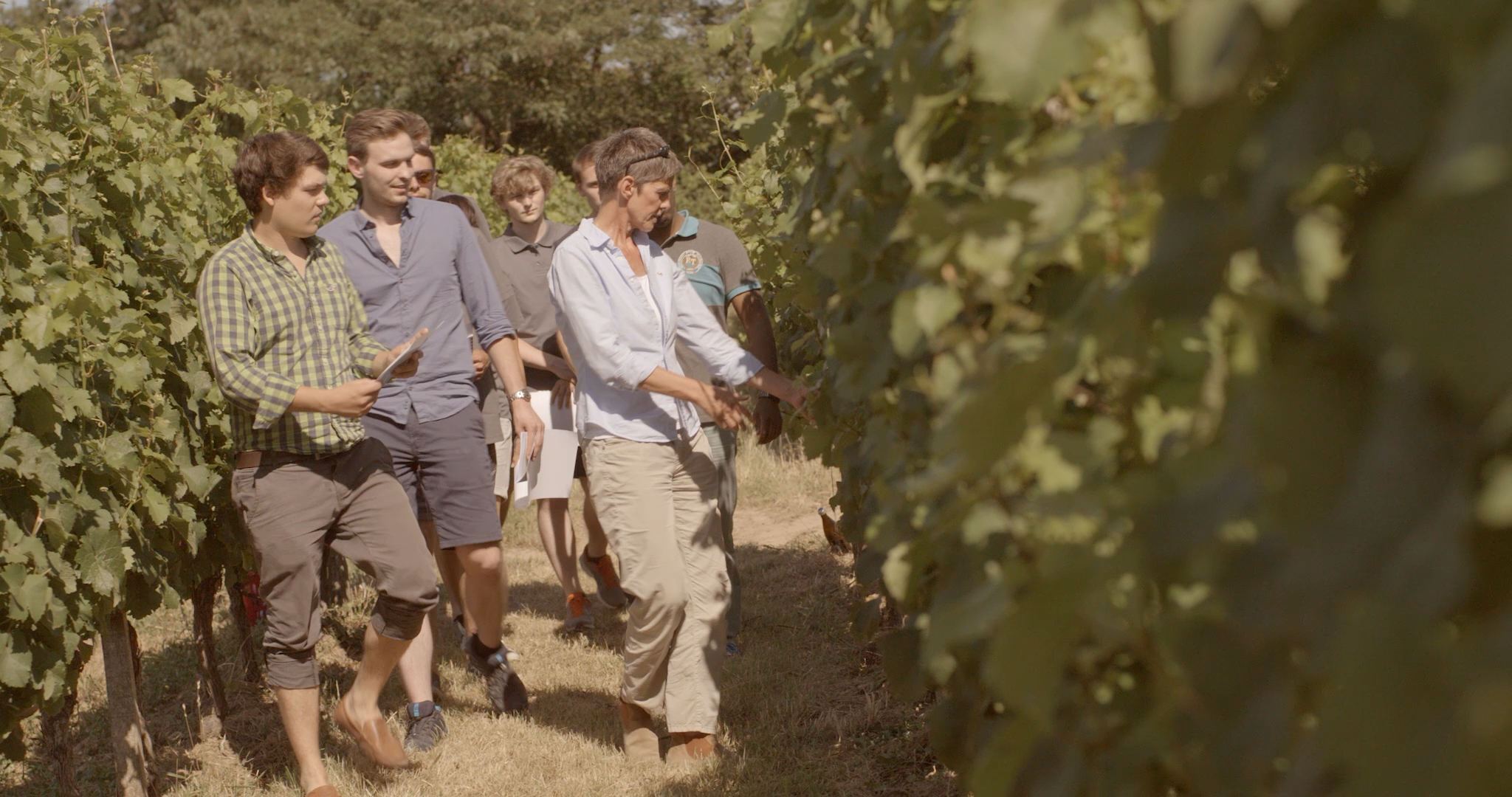 Eine Gruppe von Studierenden läuft mit ihrer Dozentin durch eine Rebzeile. © Hochschule Geisenheim