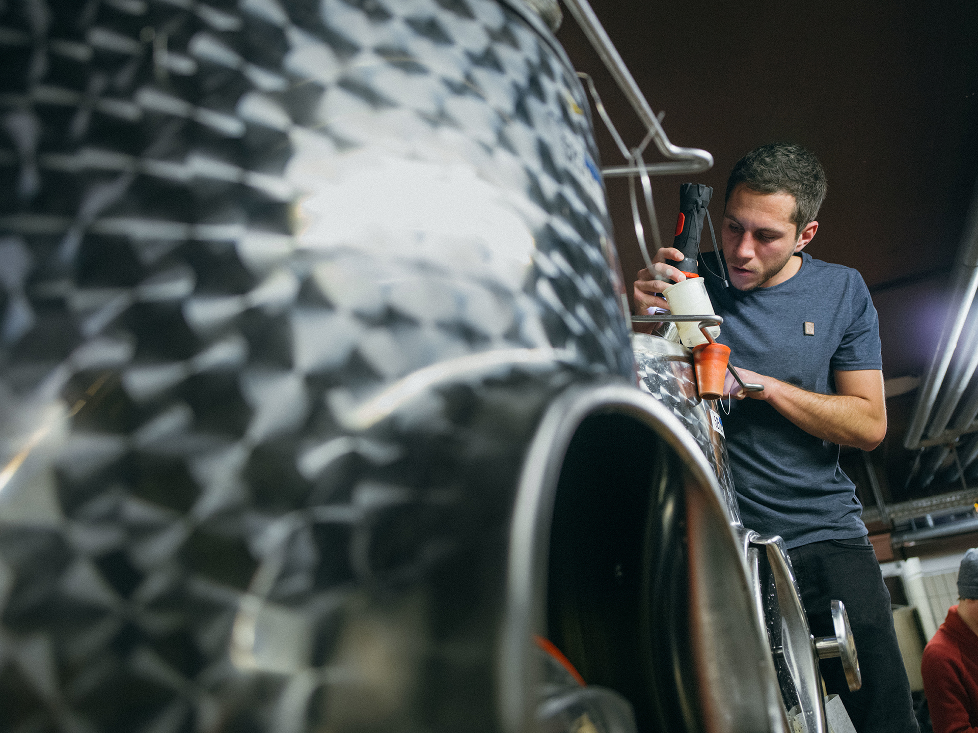 Ein junger Mann steht an einem Stahltank im Weinkeller. © Hessen schafft Wissen – Steffen Böttcher