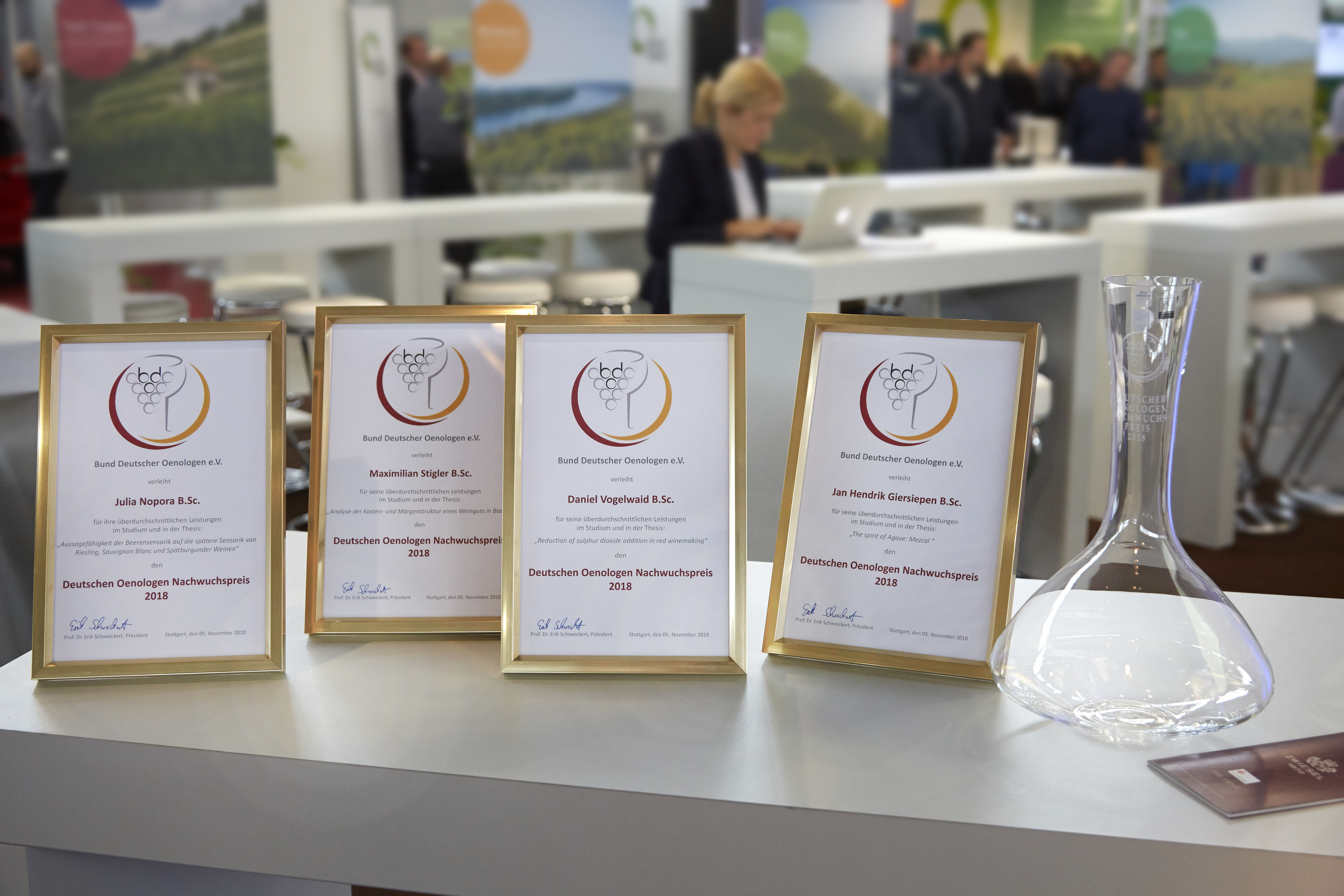 Every year the association of German enologists awards a prize to students for excellent theses in enology, viticulture, international wine business and beverage technology. Hochschule Geisenheim University, Heilbronn and Neustadt each hand in bachelor theses. The association’s committee evaluates the theses and chooses the best work from each field. Laureates win 300 euros and an engraved decanter by the “Zwiesel Kristallglas” company.