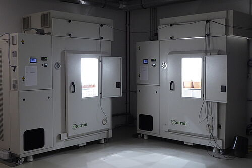 Four climate chambers HGC 0714, Weiß-Technik, are available for experiments on the effect of temperature, humidity, irradiation and CO2 content.