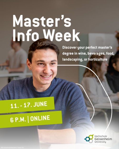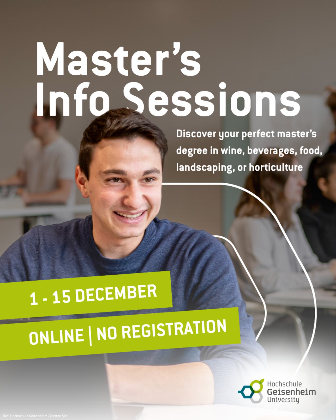 Then make sure to attend our Virtual Master's Programs Info Week this December and learn everything you need to know about Hochschule Geisenheim University's specialized master's degree programs in the fields of wine, beverages, food safety, landscape architecture, and horticulture.