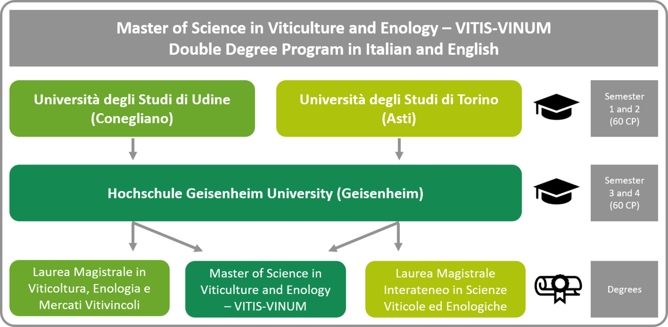 The double-degree master's program Viticulture and Enology - VITIS-VINUM is jointly offered by a consortium of the universities of Turin (in association with the universities of Milan, Palermo, Sassari and Foggia), Udine (in association with the universities of Padua, Verona and Bolzano) and Geisenheim.