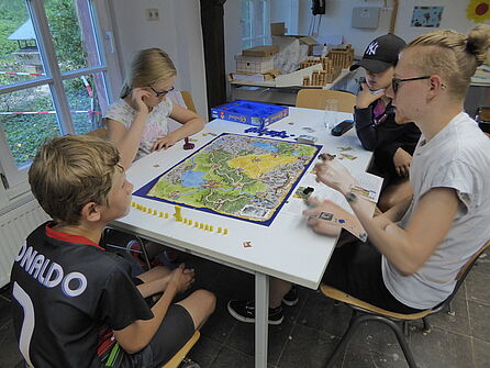 [Translate to English:] Kinder und Betreuer spielen ein Brettspiel