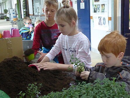 [Translate to English:] Kinder mit Erde im Gewächshaus