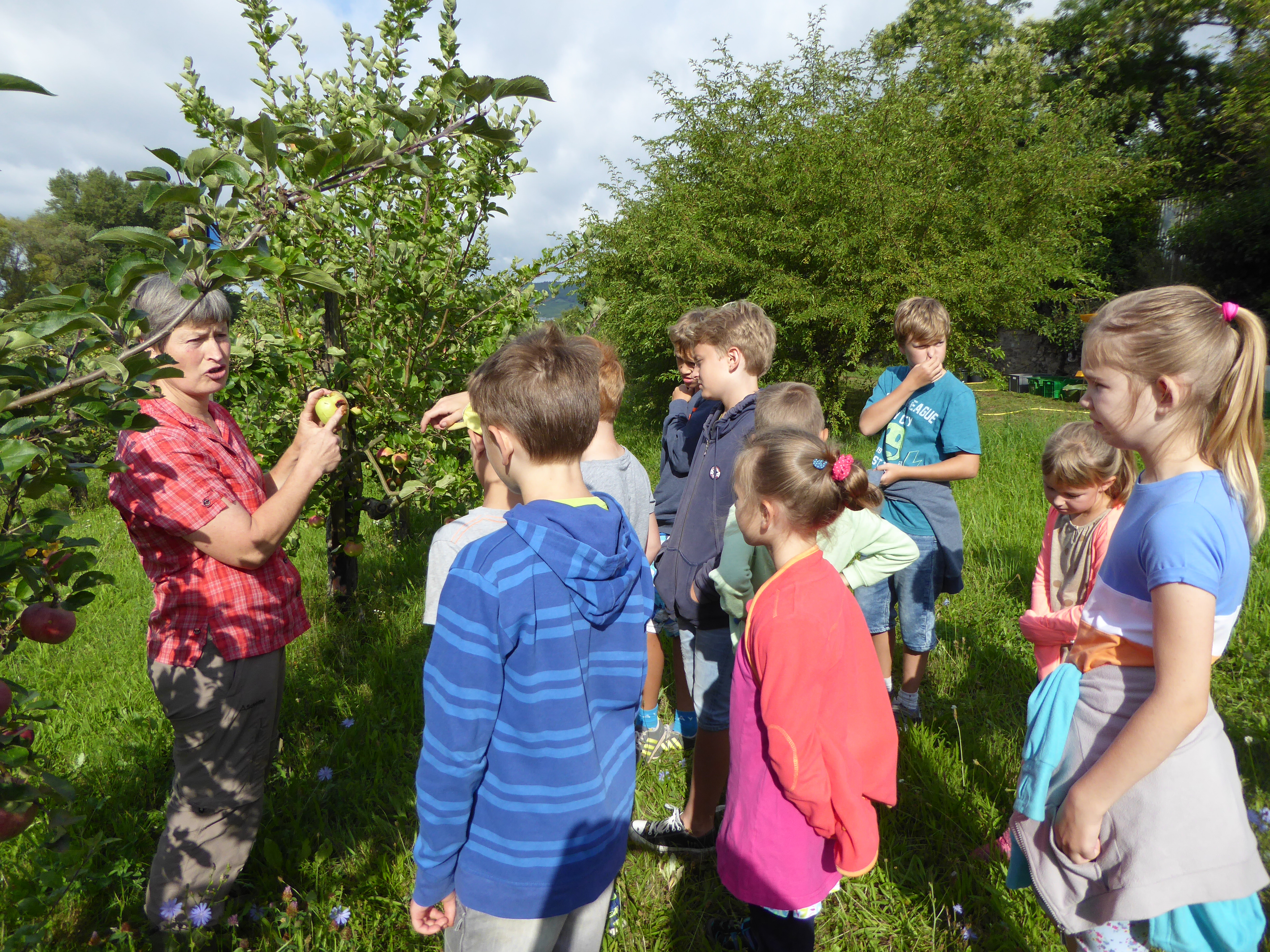 [Translate to English:] Kinder bekommen eine Führung durch die Apfelbaumwiese