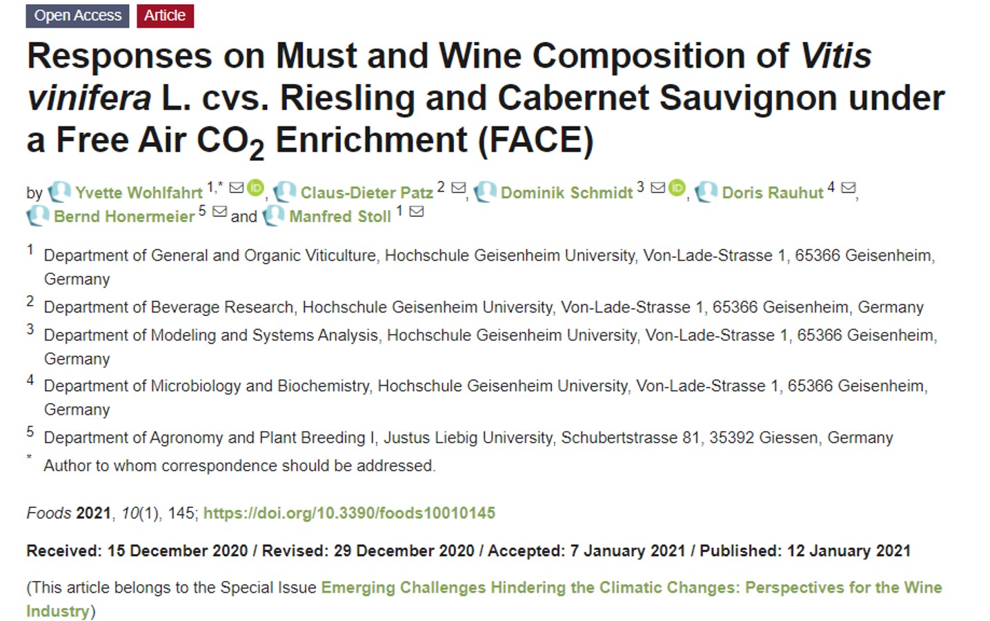 Zwei Rebsorten, Riesling und Cabernet Sauvignon, sind in einem Ringsystem 2012 gepflanzt wurden. Insgesamt sind sechs Ringe am Standort installiert worden, wobei Reben in drei Ringen mit erhöhtem CO2 versorgt werden und die restlichen Ringe als Kontrolle dienen. Im Zeitraum 2014 bis 2017 bearbeitete Yvette Wohlfahrt (M.Sc.) in ihrer Doktorarbeit Fragen zum Einfluss von erhöhtem CO2 auf die Physiologie der Rebe. Hierzu werden Gaswechsel- und Chlorophyllfluoreszenzmessungen über die gesamte Vegetationsperiode durchgeführt. Mit erhöhter CO2-Konzentrationen ist bei Pflanzen des C3 Photosynthesetyps mit gesteigertem Wachstum ober- und unterirdischer pflanzlicher Biomasse zu rechnen. Die Untersuchungen sind auf einen längeren Zeitraum ausgerichtet um so auch die Effekte der Rebenttwicklung über die Etablierungsphase hinaus verfolgen zu können.