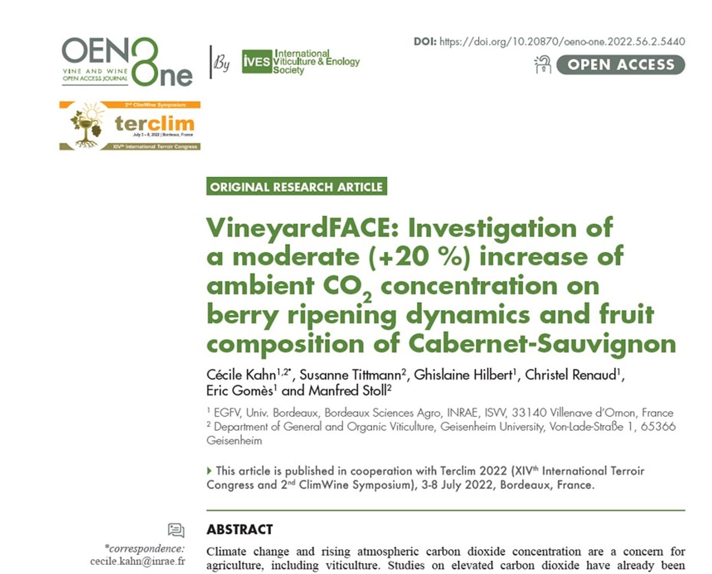 Eine Kooperation mit Wissenschaftler*innen der HGU und der Arbeitsgruppe Eric Gomes vom EGFV in Bordeaux, die den Einfluss der erhöhten CO2 Konzentration auf Reben im WeinbergsFACE untersuchen. Start war im November 2019.