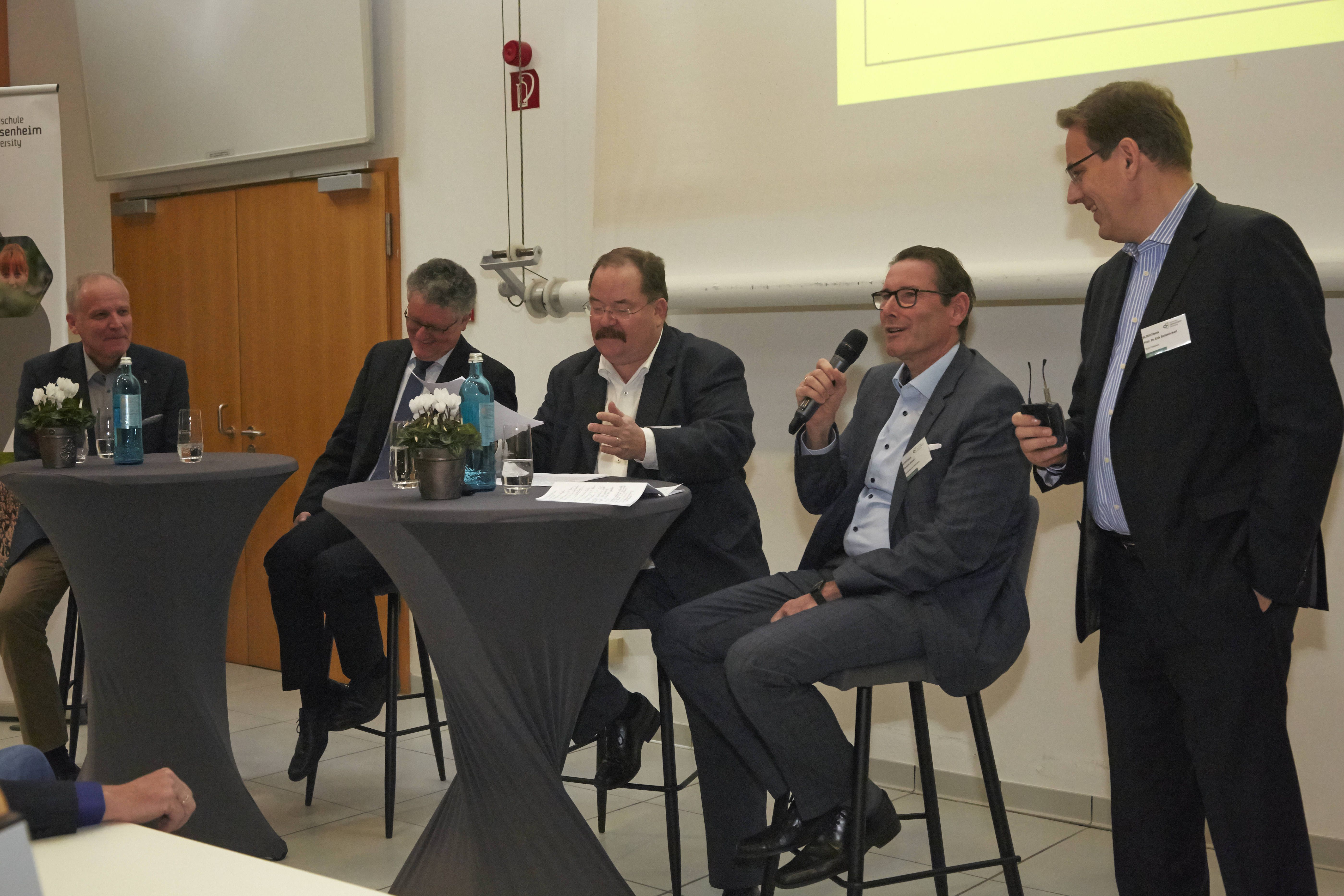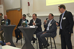 Die Podiumsdiskussion sorgte für einen schwungvollen Auftakt der Tagung. Es diskutierten (v.l.) Dr. Michael Köhler, Dr. Hans Eichele, Peter Rotthaus und Gerhard Brauer, moderiert von Prof. Dr. Erik Schweickert, Präsident des BDO; Bildquelle: Winfried Schönbach