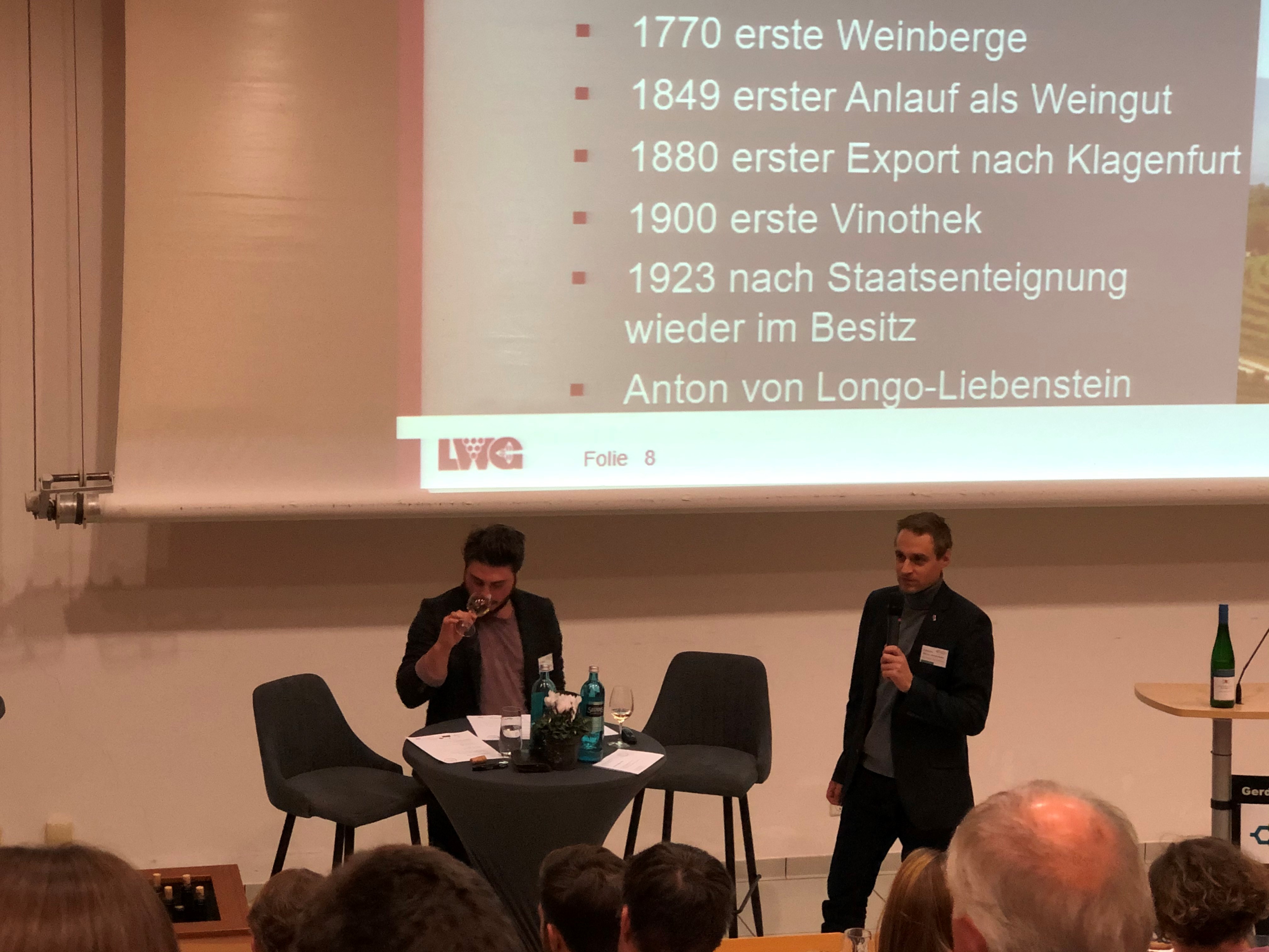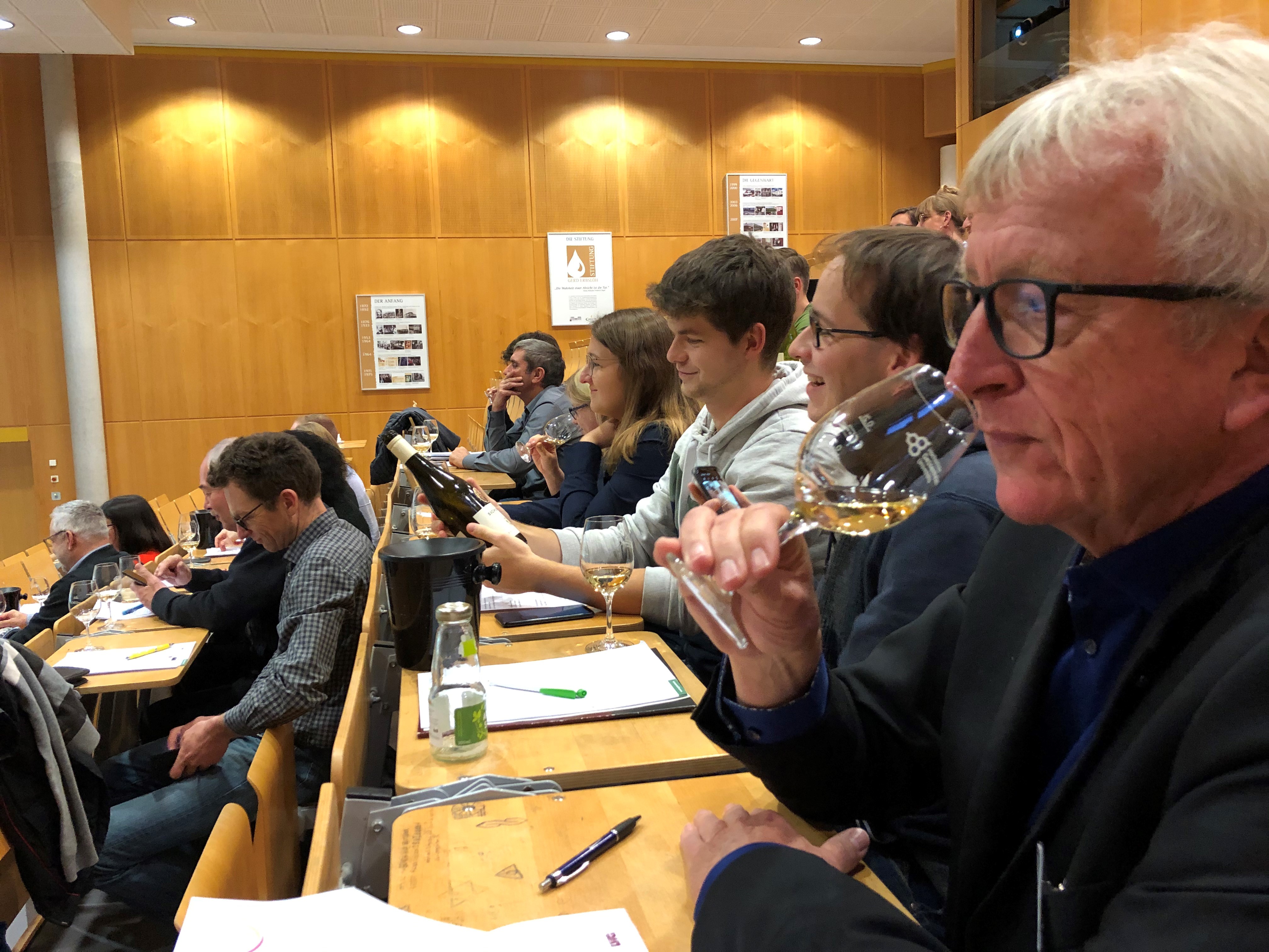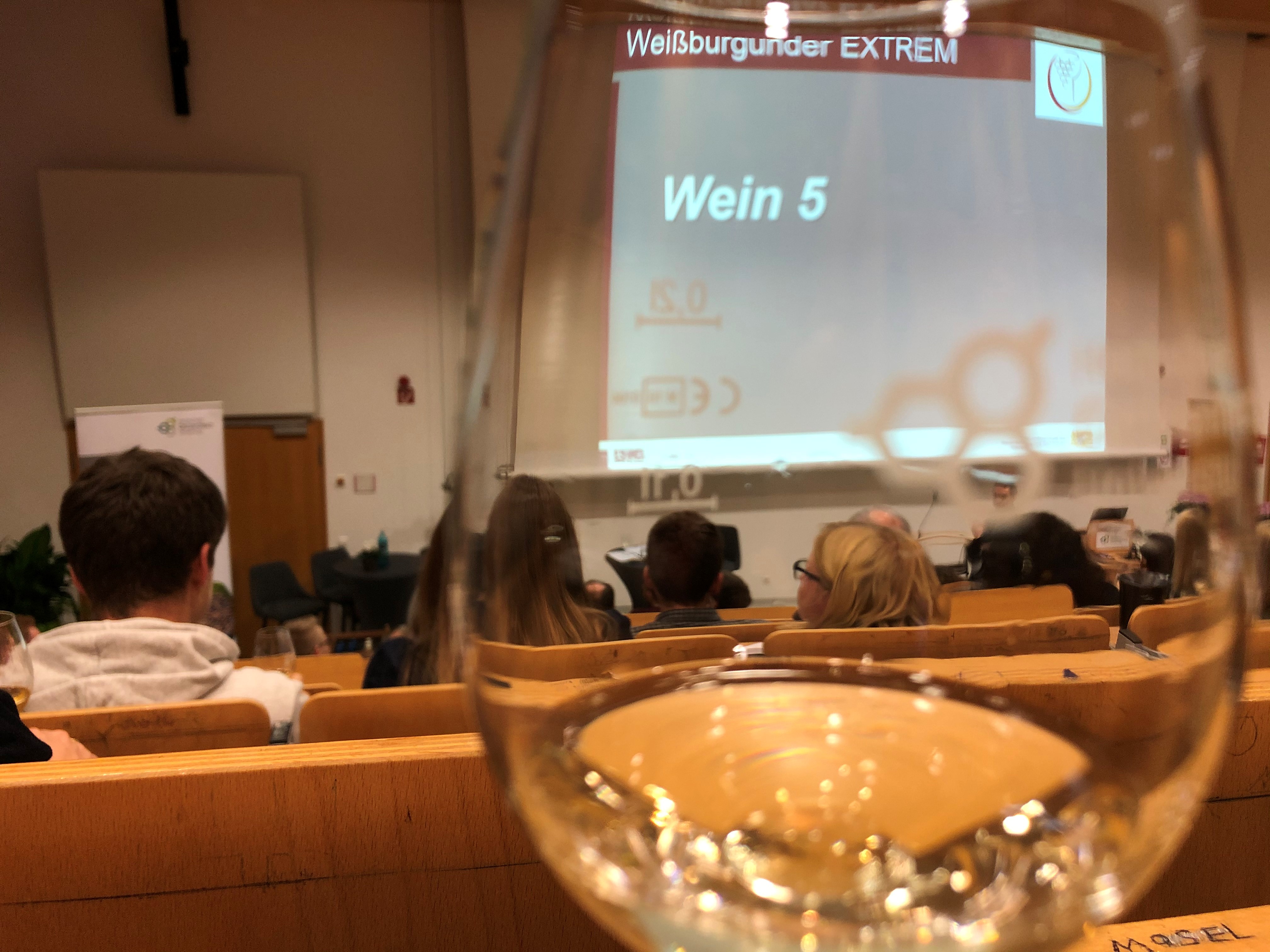 Nach der Vorstellung neuer Wissenschaftler und Dozenten an den Standorten Heilbronn, Neustadt/W. und Geisenheim wurden die Fachvorträge abgeschlossen mit einer 8-stelligen Probe von „extremen“ Weißburgunder-Weinen, geleitet von Johannes Burkert, Oenologe bei der LWG, Veitshöchheim.