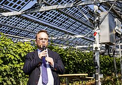 „Die Hochschule Geisenheim bietet ein beeindruckendes Spektrum an praxisnahen Studienangeboten und treibt intensive Forschungsaktivitäten zu wichtigen Herausforderungen der Zukunft voran. In ihren verschiedenen Themenbereichen, angefangen von Wein und Getränken, über Gartenbau und Lebensmittel, bis hin zur Landschaftsarchitektur, wirkt sie als hessische Hochschule damit weit über unser Bundesland sowie über Deutschland hinaus in die Welt. Die VitiVoltaic-Anlage ist hierfür ein beeindruckendes Beispiel. Schon als Bundestagsabgeordneter habe ich mich intensiv mit der Agri-PV beschäftigt. Daher war es mir eine große Freude, die Forschungs- und Transferplattform kennenlernen und einweihen zu dürfen“, fasst Timon Gremmels, hessischer Wissenschaftsminister seine Eindrücke des Antrittsbesuchs und der Einweihung der „VitiVoltaic“-Plattform zusammen.