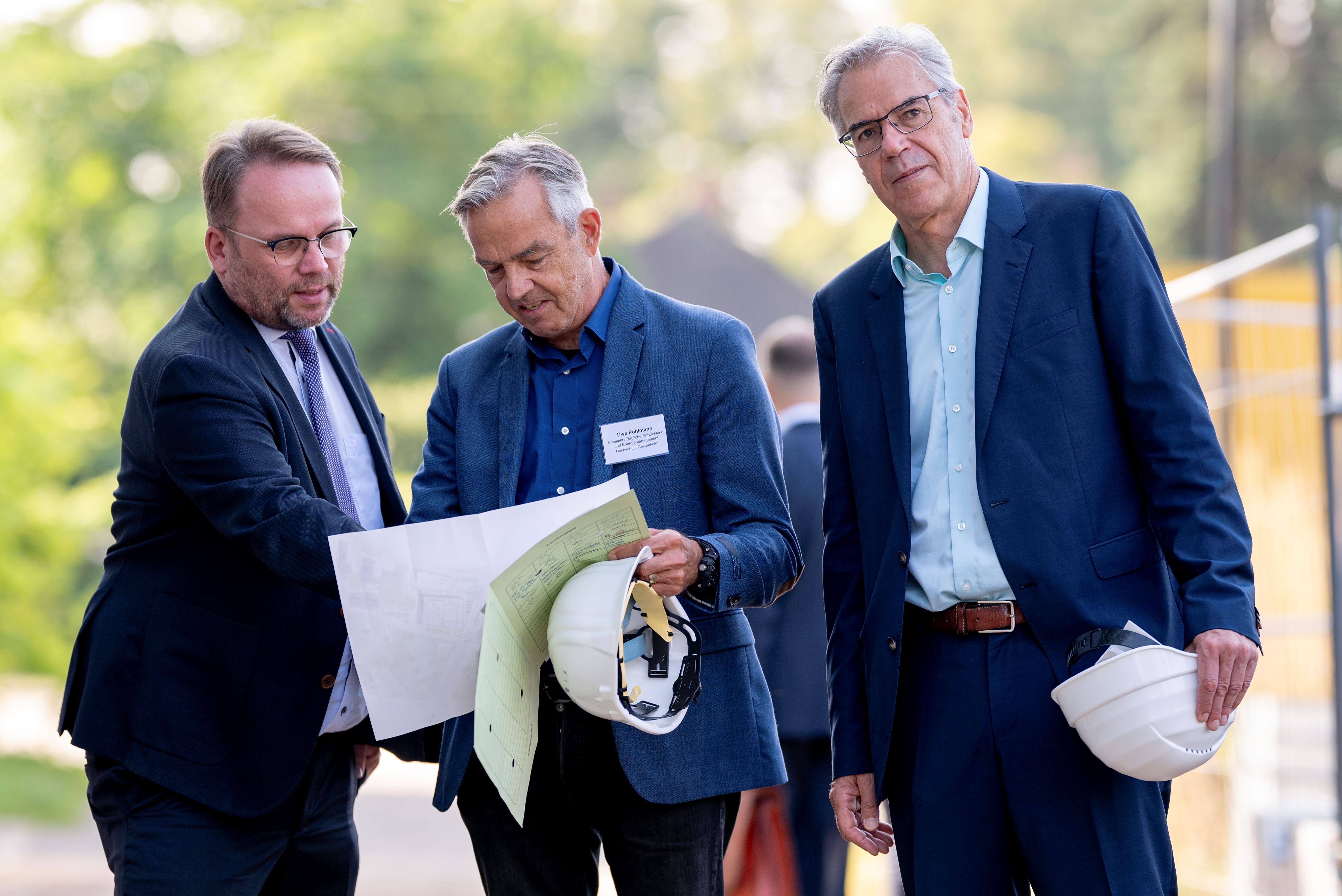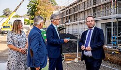 Besichtigung der laufenden Neubauprojekte auf dem Campus der Hochschule, v.l.n.r.: Prof. Dr. Mirjam Hey (Vizepräsidentin Lehre der Hochschule Geisenheim), Uwe Pohlmann (Ingenieur an der Hochschule Geisenheim), Prof. Dr. Hans Reiner Schultz (Präsident der Hochschule Geisenheim), Timon Gremmels (Hess. Wissenschaftsminister). (Quelle: Torsten Silz / Hochschule Geisenheim)