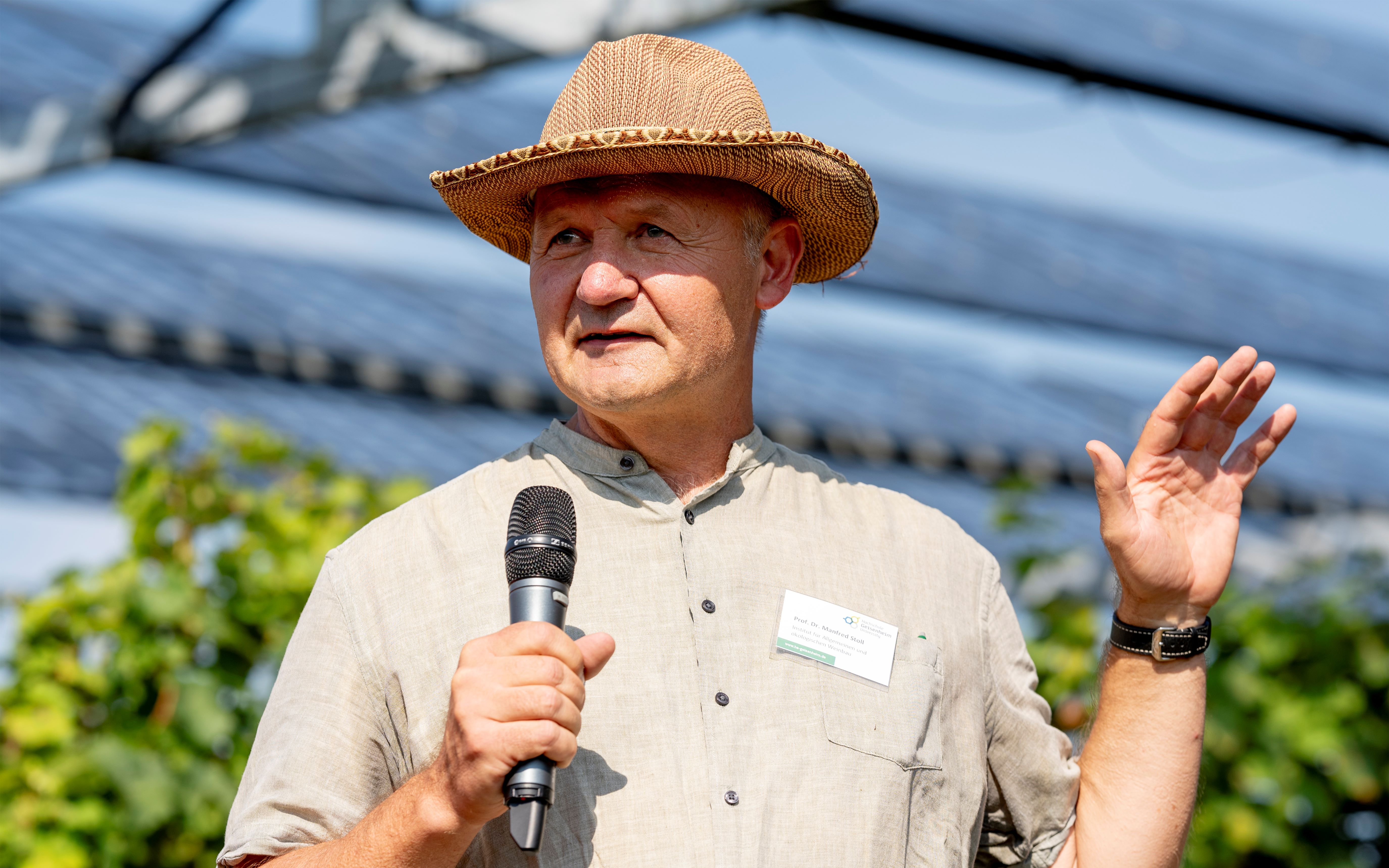 Prof. Dr. Manfred Stoll bei der Erläuterung der Agri-PV-Anlage (Quelle: Torsten Silz / Hochschule Geisenheim)