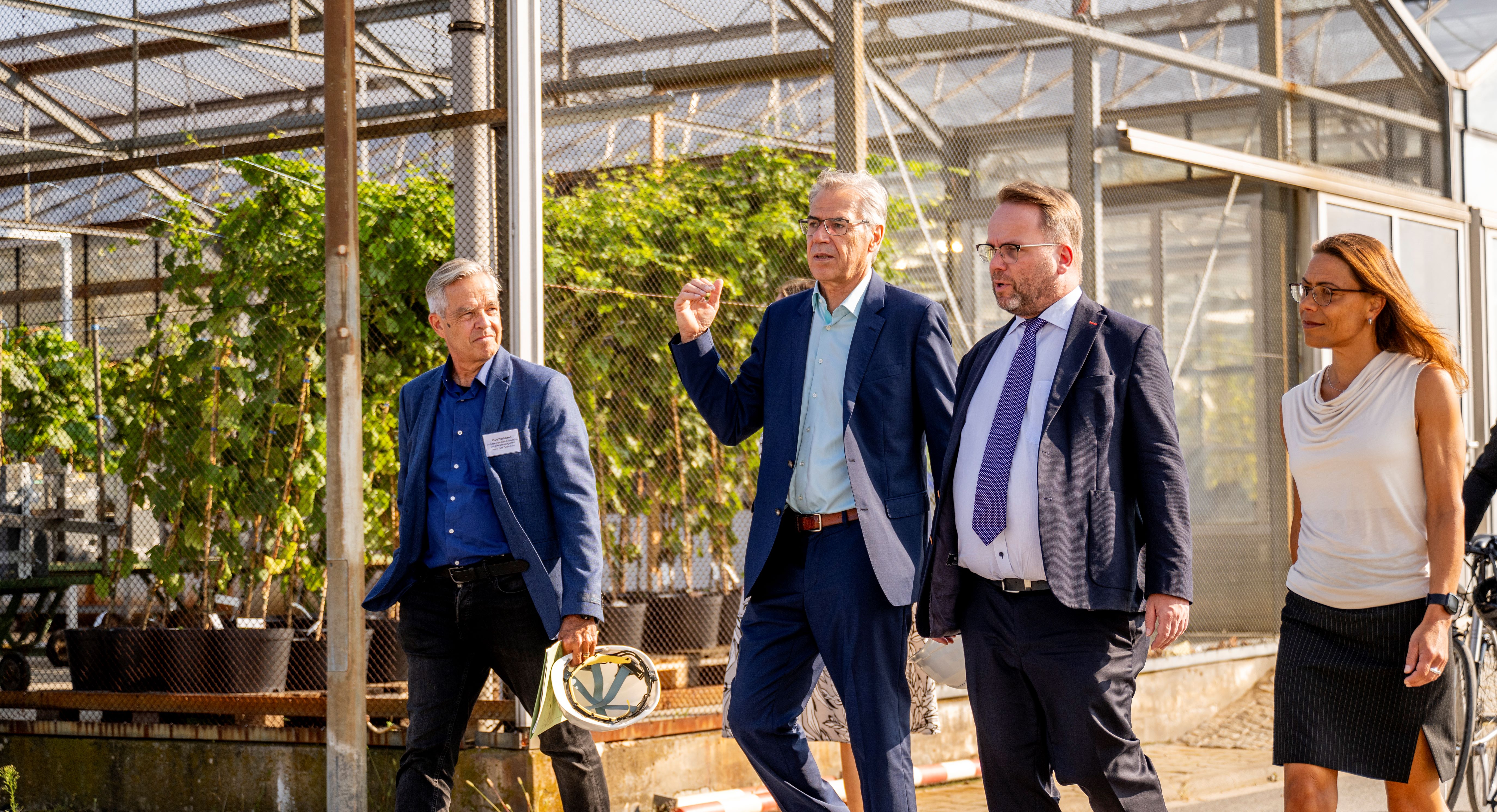Rundgang über den Campus (v.l.n.r.): Uwe Pohlmann (Ingenieur an der Hochschule Geisenheim), Prof. Dr. Hans Reiner Schultz (Präsident der Hochschule Geisenheim), Timon Gremmels (Hess. Wissenschaftsminister), Marion Waldeck (Kanzlerin der Hochschule Geisenheim). (Quelle: Torsten Silz / Hochschule Geisenheim)