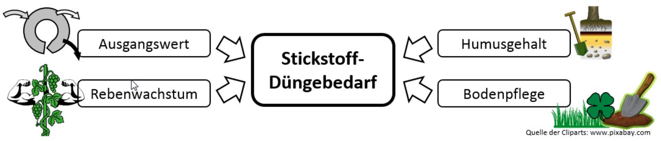 Bei der N-Düngung ist es wichtig, immer die natürliche Nachlieferung aus der Mineralisation des Bodenhumus zu berücksichtigen, welche oft den N-Bedarf der Rebe abdeckt. Dieses Nachlieferungspotential ist hauptsächlich von drei Faktoren abhängig: (1) Humusgehalt des Bodens, (2) Bodenmanagement und (3) regionale Witterung