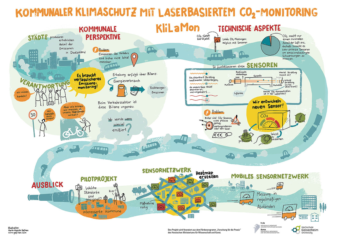 Unser Gemeinschaftsprojekt mit der Hochschule Darmstadt befasst sich mit dem Monitoring von Treibhausgasemissionen in Kommunen. Um die Effizienz durchgeführter Klimaschutzmaßnahmen zu gewährleisten und lokale Klimaschutzpläne gegebenenfalls anpassen zu können, ist es wichtig, die Reduktion der Emissionen kontinuierlich zu überprüfen. Das bisherige Monitoring beruht auf der Bilanzierung von Treibhausgasemissionen und ist stark abhängig von einer umfangreichen Datenverfügbarkeit. Diese ist besonders im Verkehrssektor jedoch oft nicht ausreichend, um präzise Aussagen über die Entwicklung der Emissionen treffen zu können. Mit dem Ziel, Kommunen neue Monitoring-Instrumente zur Verfügung zu stellen, mit denen der kommunale Klimaschutz besser gesteuert werden kann, arbeiten wir an der Entwicklung eines innovativen Sensornetzwerks für die lokale Bestimmung des CO2-Gehalts in der Atmosphäre. Dabei wird auf technischer Seite an der Entwicklung eines präzisen und dennoch preiswerten CO2-Sensors gearbeitet, welcher für den Einsatz in einem Sensornetzwerk zur lokalen Überwachung des CO2-Gehalts geeignet ist. Parallel dazu untersuchen wir auf der Anwendungsseite konkrete Einsatzmöglichkeiten des Sensornetzwerks und führen Gespräche mit kommunalen Vertreter:innen und Expert:innen aus dem Bereich Klimaschutz über die Anforderungen, die das laserbasierte Monitoring erfüllen müsste.