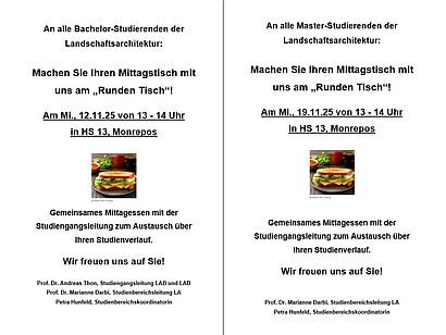 Am Dienstag, den 13. Mai 2025, sind alle Bachelor-Studierenden der Landschaftsarchitektur-Studiengänge LAB und LAD herzlich eingeladen, an unserem gemeinsamen „Runden Tisch“ teilzunehmen.
