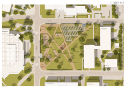 Nicht nur der Campus der Hochschule Geisenheim ist durch umfassende Bautätigkeiten im Wandel, ähnlich sieht es auch auf der anderen Rheinseite an der Johannes Gutenberg-Universität (JGU) Mainz aus: Durch den Abriss eines Gebäudes entsteht in unmittelbarer Nähe zur zentralen Mensa im Kernbereich des Campus ein Freiraum, der interimsweise als Campus-Garten genutzt werden soll. Wie ein solcher Raum gestaltet sein kann, der für Studierende, Mitarbeitende sowie Spaziergängerinnen und Spaziergänger Aufenthaltsqualität und vielfältige Nutzungsmöglichkeiten bietet, dazu entwickelten Geisenheimer Bachelor- und Master-Studierende der Landschaftsarchitektur im Rahmen eines Wettbewerbs Ideen.