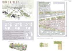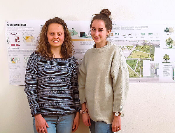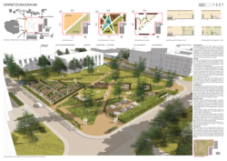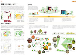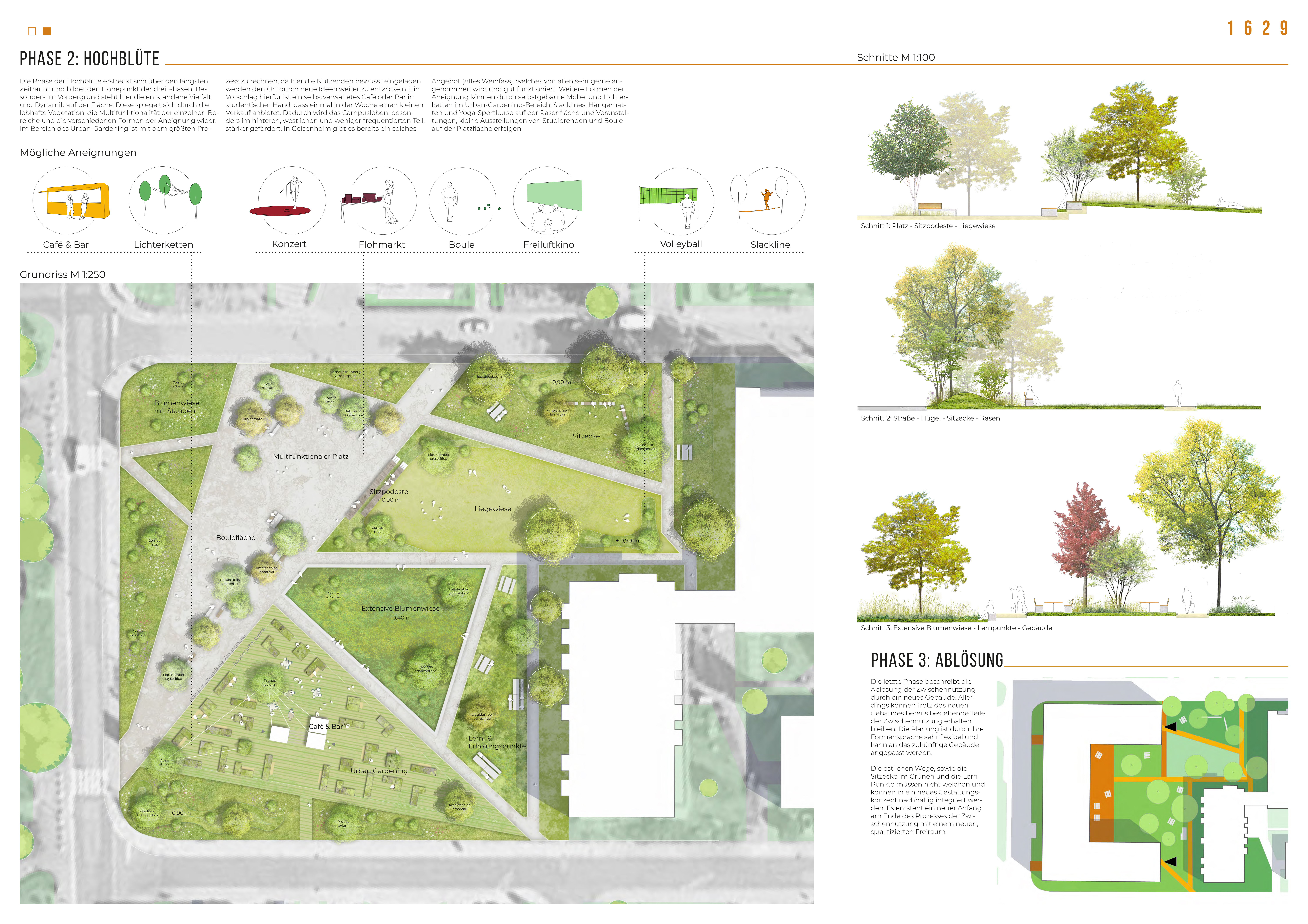 In ihrem Siegerentwurf sehen Anna Ketelhut und Johanna König eine überzeugende räumliche Grundstruktur vor, die unterschiedliche Nutzungen ermöglicht. Die Nutzerinnen und Nutzer können sich die Fläche aneignen und in einem großzügigen Urban-Gardening-Bereich in direkter Nachbarschaft zu einem Café gärtnern. Wenn das Areal eines Tages bebaut wird, wandern die Angebote in andere Teile des Campus. Dieser prozessuale Gedanke spiegelt sich auch in der Pflanzenwahl wider: Neben dem Wachstumsprozess der schattenspenden Bäume und Sträucher soll auch die Dynamik der vier Jahreszeiten erkennbar sein. Für die Wiesenflächen sehen die Studentinnen naturnahe Saaten vor.