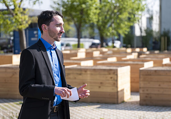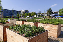 4.000 Quadratmeter Blumenwiese und 24 neu gepflanzte Jungbäume statt einer tristen Freifläche: Der vom Geisenheimer Master-Studenten der Landschaftsarchitektur Tom Renne gestaltete Campusgarten an der JGU Mainz trägt seinen Namen zu Recht. Tische und Sitzbänke aus Beton-Elementen laden zum gemeinsamen Arbeiten oder Essen ein, zwei Tischtennisplatten zu sportlicher Betätigung. Für die 60 Hochbeete aus Holz können Studierende und Mitarbeitende der JGU oder des Studierendenwerks Patenschaften übernehmen – so lautete eine der Vorgaben in dem vom Landesbetrieb Liegenschafts- und Baubetreuung (Landesbetrieb LBB) durchgeführten Ideenwettbewerb unter Studierenden der Landschaftsarchitektur an der Hochschule Geisenheim. Aus insgesamt vier prämierten Arbeiten wählte das Präsidium der JGU den mit dem 2. Platz und 500 Euro Preisgeld ausgezeichneten Entwurf von Tom Renne zur Umsetzung aus.
