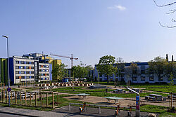 Bei der garten- und wegebaulichen Umsetzung achtete das Projektteam der LBB-Niederlassung Mainz auf nachhaltige Materialien und eine klimagerechte Auswahl der Pflanzen. So wurden neun verschiedene Baumarten gesetzt, die mit heißeren Sommern und längeren Trockenphasen eher zurechtkommen, darunter Purpur-Erle, Ginkgo, Feldahorn, Baumhasel und Kornelkirsche. Die vorhandenen Wiesenflächen wurden mit Gräser- und Blumensamenmischungen nachgesät, die Bienen und anderen Insekten Nahrung bieten. Die Wege und Plätze im Campusgarten erhalten eine dreischichtige wassergebundene Decke, durch die der Niederschlag versickern kann. Bei den Plätzen besteht eine der Unterschichten aus gekörntem Recycling-Beton. Um den Hochbeeten festen Stand zu geben, wurden sie auf ebenfalls wasserdurchlässiges Rasengitterpflaster platziert.
