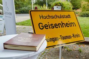 Schild Hochschulstadt Geisenheim im Hintergrund von liegenden Buch