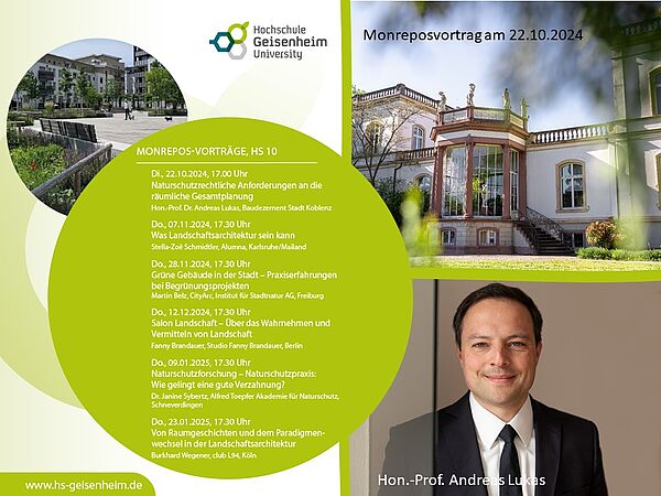 Bauleitpläne sollen gemäß dem Baugesetzbuch dazu beitragen, die natürlichen Lebensgrundlagen zu schützen. In der ca. 45-Minuten dauernden Vorlesung wird darauf eingegangen, wie Naturschutzbelange in einem Bauleitplan sachgerecht umgesetzt werden und es werden innovative Lösungsansätze aufgezeigt, etwa vertragliche Vereinbarungen zum strengen Artenschutz, die Lukas bei der Baufeldfreimachung für ein neues Stadtquartier in Leipzig selbst in der Praxis erprobt hat. So bietet die Veranstaltung eine gestraffte und aktuelle Einführung in die räumliche Gesamtplanung aus der Perspektive des Naturschutzes. Veranstaltungsort ist die Hochschule Geisenheim im Hörsaal 10 der Villa Monrepos.