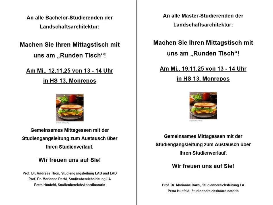 Die Studiengänge der Landschaftsarchitektur an der Hochschule Geisenheim laden im November alle Studierenden herzlich zum gemeinsamen Austausch mit der Studiengangsleitung ein. Bei einem gemeinsamen Mittagessen bieten die „Runden Tische“ die Gelegenheit, in ungezwungener Atmosphäre über den Studienverlauf, Erfahrungen und Anregungen zu sprechen.