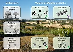 Katharina Adler setzt sich in ihrem Literaturüberblick mit weinbaulich problematischen sowie nützlichen Vogelarten und Strategien zu ihrer Förderung auseinander, legt Einflüsse von Habitatstrukturen und Managementstrategien auf Fraßschäden durch Vögel dar und leitet hieraus praxisrelevante Empfehlungen ab: Wie kann eine zielgerichtete Landschaftsgestaltung zum Schutz der Trauben gegen Vogelfraß beitragen? „Die Ergebnisse zeigen, dass es keinen Widerspruch zwischen einer Förderung der Biodiversität und eines abwechslungsreichen Landschaftsbilds einerseits und den Bedürfnissen der Winzerinnen und Winzer gibt“, resümiert Adler. Ein gezieltes Management solle die Schaffung von Nisthilfen für Singvögel und Ansitzstangen für Greifvögel einschließen. „Das sind gute Argumente dafür, künftig quasi eine ‚Flurbereinigung rückwärts‘ zu schaffen und ausgeräumte Weinbau-Landschaften mit mosaikartigen Strukturen wieder vielfältiger und attraktiver zu gestalten“, sagt Prof. Dr. Eckhard Jedicke, der die Promotion betreut und am Institut für Landschaftsplanung und Naturschutz zur Kulturlandschaftsentwicklung arbeitet.