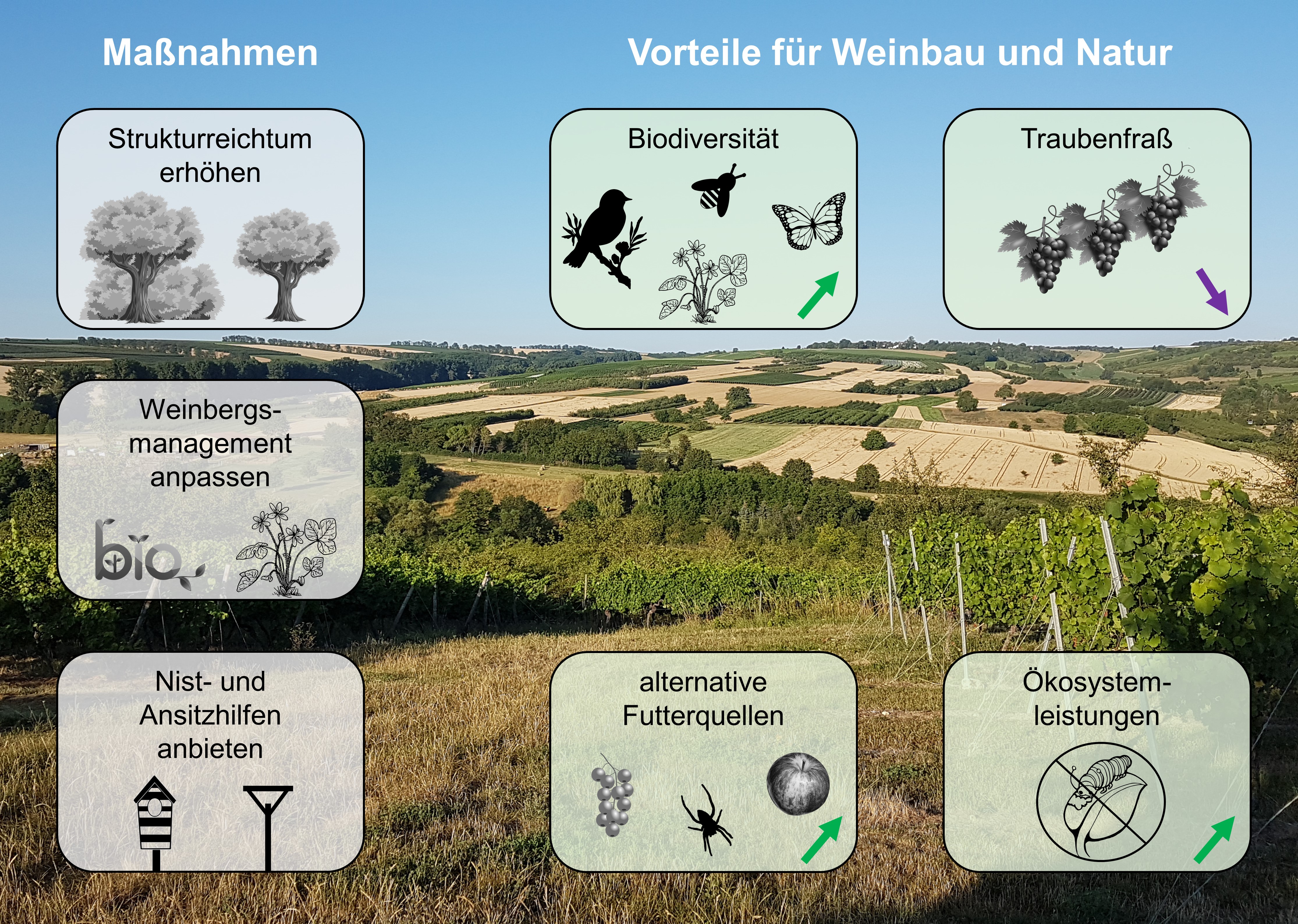 Mehr Strukturen in Weinbergen und deren Umfeld, insbesondere durch Bäume, Sträucher und artenreiches Grünland, wirken in vielfacher Hinsicht positiv. Von ihnen profitieren nicht nur Vögel, diese Arten können zugleich wichtige Ökosystemleistungen für den Weinbau übernehmen und zur biologischen Schädlingsbekämpfung beitragen. Denn fast alle Vogelarten sind mindestens zur Brutzeit Insektenfresser. Diese Ergebnisse ergab eine aktuelle Literaturanalyse, welche Katharina Adler, Doktorandin an der Hochschule Geisenheim, jetzt in der Fachzeitschrift „Naturschutz und Landschaftsplanung“ veröffentlichte.