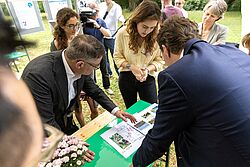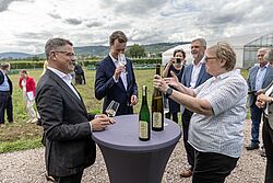 Nach der Begrüßung vor dem Müller-Thurgau-Haus mit Jubiläumssekt vom 150. Geburtstag des Lehr- und Forschungsstandortes besuchten die Gäste Promovierende der derzeit zum Thema Biodiversität auf dem Campus stattfindenden Summer School. Lucía Garstka stellte die AgriPV-Anlage und das Projekt VitiVoltaic4Future als Anpassungsstrategie an den Klimawandel vor. Emilio DeLonghi, der im deutsch-französischen Cotutelle-Verfahren promoviert, sprach über seine Forschung zur Charakterisierung von sortentypischen Aromakomponenten von Riesling Weinen. Franca-Carlotta Foerster setzt sich am Institut für Angewandte Ökologie mit der ganzheitlichen Nachhaltigkeitsbewertung der ökologischen und sozio-ökonomischen Aspekte der Weinwertschöpfungskette auseinander, Duc Le Ngoc am Institut für Lebensmittelsicherheit mit der potenziellen Allergenität von Erdnuss und Haselnuss hinsichtlich verschiedener Verarbeitungsmethoden.