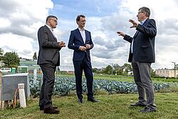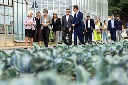 Auf dem Weg zum Zentralen Labor- und Institutsgebäude (ZIG) erläuterten die Präsidiumsmitglieder die aktuellen Bauvorhaben. Im ZIG selbst stellte Prof. Dr. Ralf Schweiggert, Leiter des Instituts für Getränkeforschung, aktuelle Arbeiten und hochmoderne analytische Ausstattung vor. Auf den sich anschließenden Freiflächen des Instituts für Gemüsebau informierte Jürgen Kleber über Versuche zur Verbesserung der Resilienz von Anbausystemen zur Minderung der Auswirkung des Klimawandels auf Kulturpflanzen. Mikro-Lysimeter, mit denen die Wassernutzungseffizienz, die Stoff- und Energieflüsse im gewachsenen Bestand unter heutigen, sowie künftigen klimatischen Bedingungen und CO2-Konzentrationen erprobt und erforscht werden, helfen bei der Entwicklung eines zukunftsfähigen Sonderkulturanbaus.