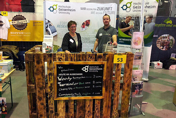 Auch die Hochschule Geisenheim war in diesem Jahr wieder mit einem Stand vertreten – bereits zum vierten Mal. Im Ausschank waren ein leichtes Kirschbier, ein Stout und ein Holzfassgereiftes Bockbier. Zudem hatten die Hochschulvertreterinnen und -vertreter vor Ort als alkoholfreie Alternative eine dunkle Variante der Campunade auf Eisteebasis dabei. Den Stand der Hochschule Geisenheim betreuten Arne Sperl und Tim Dreifke aus dem Getränketechnologischen Zentrum, Ruth Lehnart vom Institut für Bodenkunde und Pflanzenernährung sowie die Getränketechnologiestudenten Christian Altenkirch und Philipp Hemmes. Zum Bier gab es am Hochschulstand auch viele gute Gespräche mit zahlreich Interessierten; die Besucherinnen und Besucher zeigten sich beeindruckt vom Studienangebot der Hochschule Geisenheim.