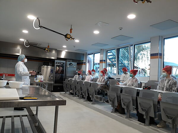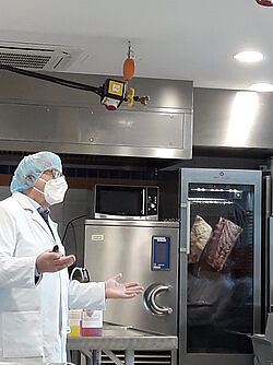 Die Modulverantwortliche seitens der Hochschule, Dr. Eva Spindler-Raffel vom Institut für Lebensmittelsicherheit, bemühte sich deshalb im engen Austausch mit den Lehrbeauftragten um eine Alternative. Denn: Die praktische Beschäftigung mit der Herstellung von Lebensmitteln ist wesentlicher Bestandteil des Studiengangs. Horst Brauer, der auch an der Frankfurter Fleischer- und Bäcker-Fachschule J.A. Heyne unterrichtet, stellte den Kontakt zum BTZ Weiterstadt her. Dieses verfügt über ein hervorragend ausgestattetes Technikum zur Fleischverarbeitung – und dies stellte das Fachzentrum der Hochschule zur Nutzung zur Verfügung.